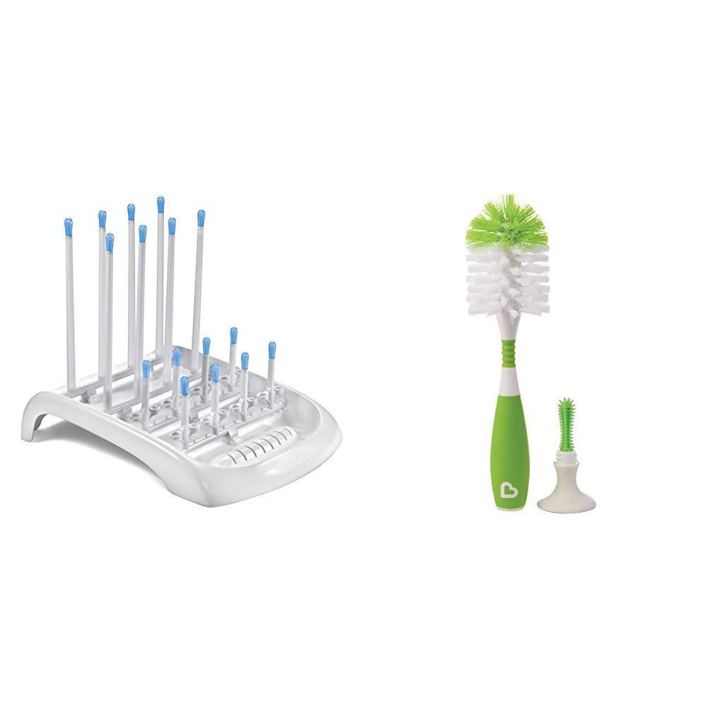 A escova 2-em-1 da Munchkin tem um projeto e uma qualidade originais com as cerdas macias e uma ponta forte da esponja para esfregando lugares hard-to-Clean. A escova de bico é armazenada convenientemente no punho para ser fácil de guardar e encontrar. Anti-deslizamento alça torna fácil de segurar quando molhado. As cerdas de nylon são duráveis e macias.
