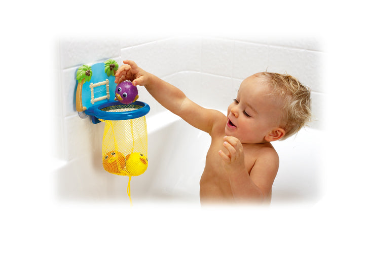 Este brinquedo de banho é um slam dunk por diversão, com jogo real para meninos e meninas. Ventosas fortes prendem a tabela à parede da banheira para uma diversão sem fim. Este brinquedo de banho vem com 3 peixes coloridos que atuam como bolas e brinquedos super squirter para ainda mais diversão. As crianças podem tentar marcar pontos jogando peixe no aro, ou apenas brincar com o peixe flutuante. De qualquer forma, este brinquedo é uma boa pedida para manter as crianças envolvidas na banheira.