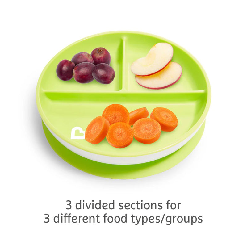 Estes pratos coloridos para bebês e crianças pequenas, com base de sucção para minimizar derramamentos, possuem três compartimentos com laterais altas que impedem que os alimentos se toquem, facilitando a alimentação independente.