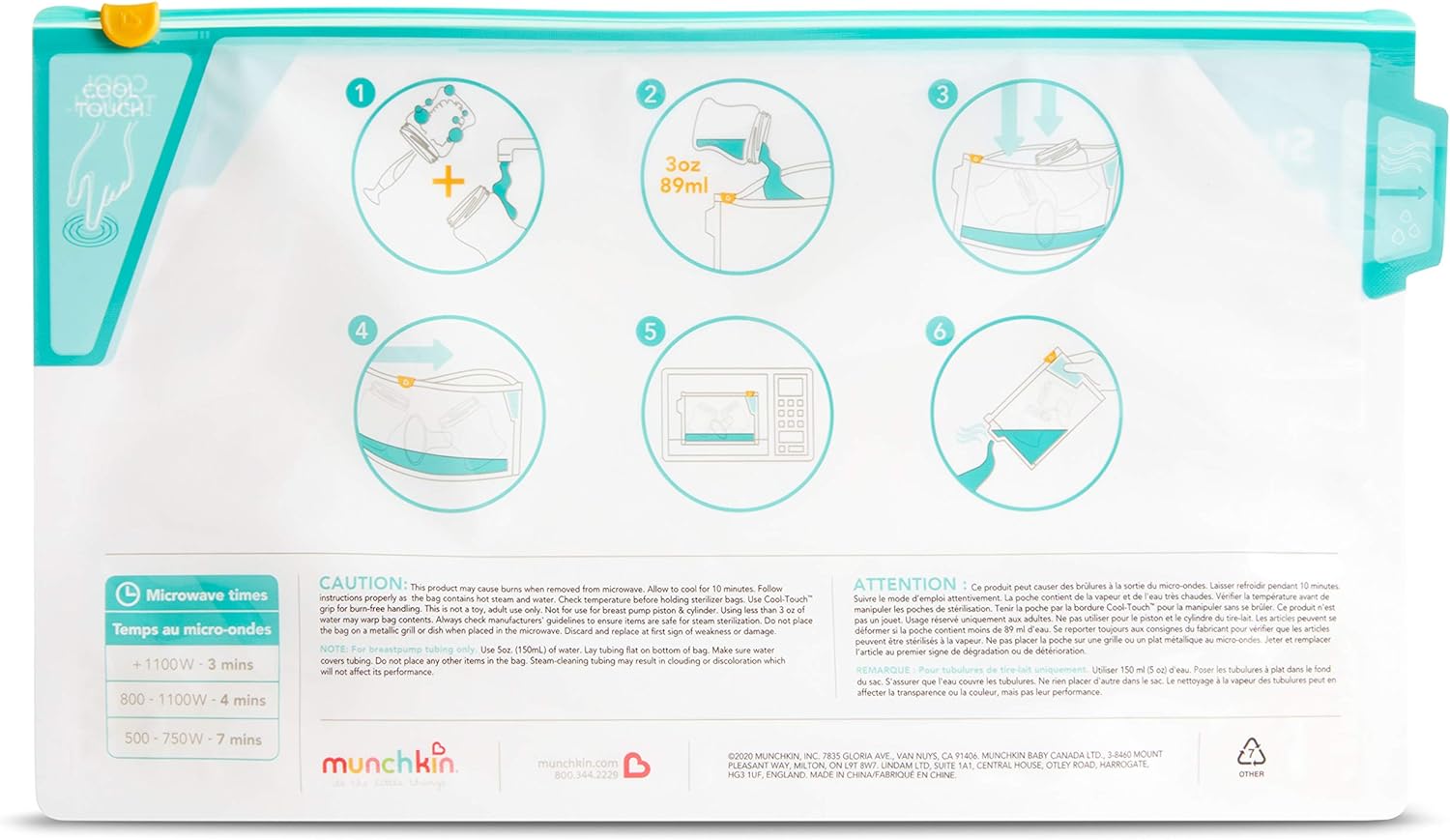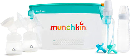 - SACOS ESTERILIZADORES DE MICROONDAS MUNCHKIN BABY: Pacote de seis sacos grandes reutilizáveis para esterilização de mamadeiras com 30 utilizações para cada saco. Os sacos esterilizadores leves e portáteis podem ser marcados após cada utilização.