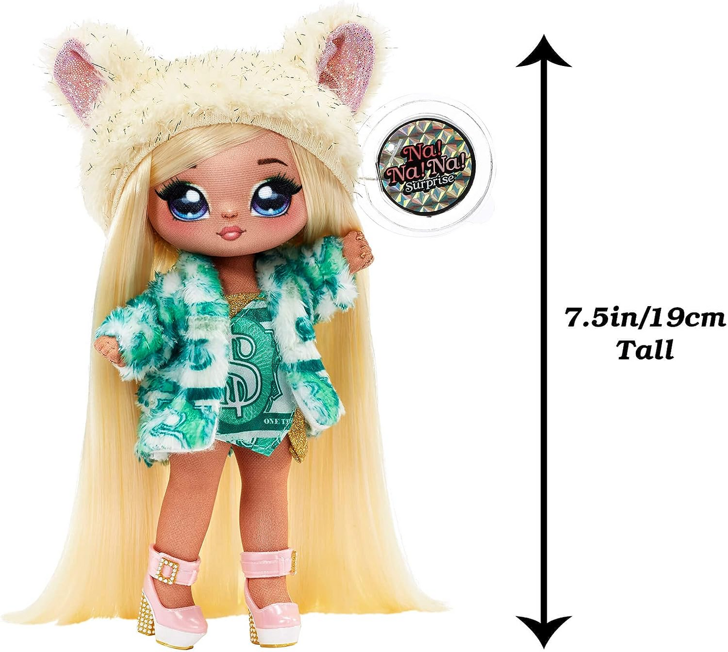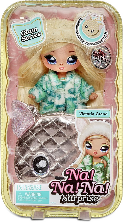 Na! Na! Na! Surprise Boneca fashion 2 em 1 e bolsa metálica série Glam - colecionável - boneca loira em vestido verde e chapéu de orelha de cachorro com bolsa chihuahua - Victoria Grand