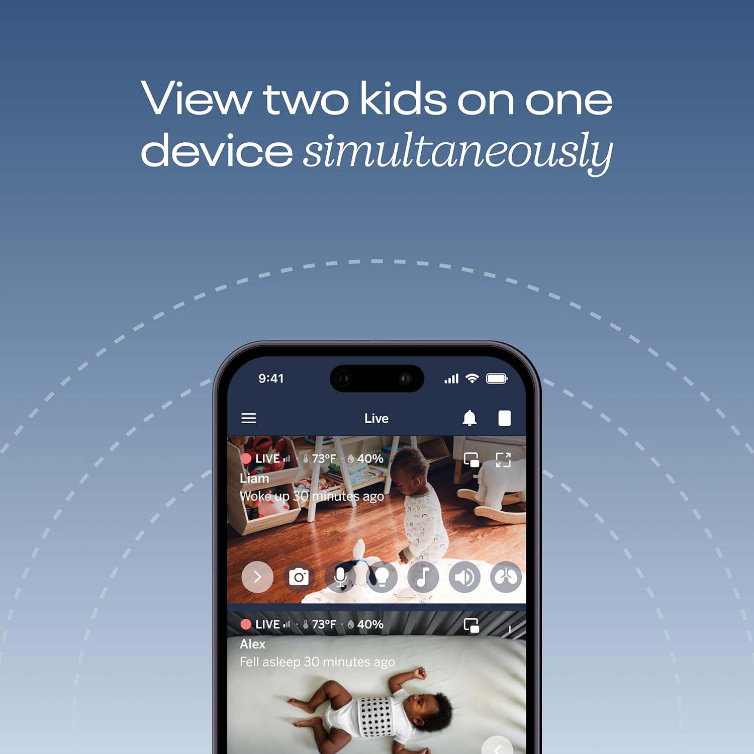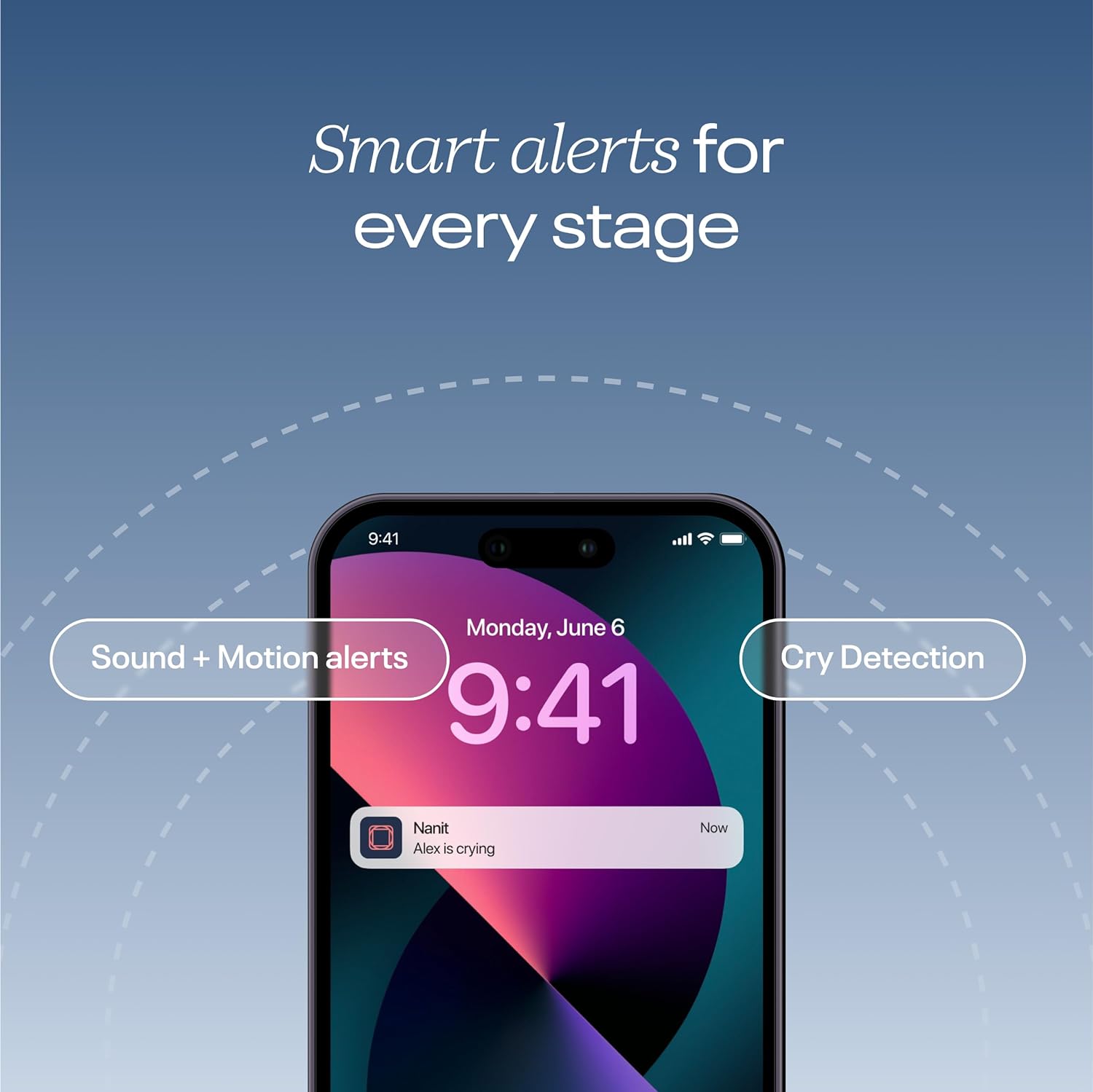 - Alertas inteligentes: Nanit detecta e notifica você no aplicativo quando o bebê realmente precisa de você - desde Zona de Alerta até Detecção de Choro e alertas de som e movimento em tempo real. O recurso Alert Zone (exclusivo para o Flex Stand) permite que você detecte se seu filho entrou em uma área proibida, acionando um alerta para seu dispositivo* Rastreamento e análise do sono,* além de monitoramento de movimento respiratório sem sensor, monitoramento de temperatura + umidade e áudio bidirecional