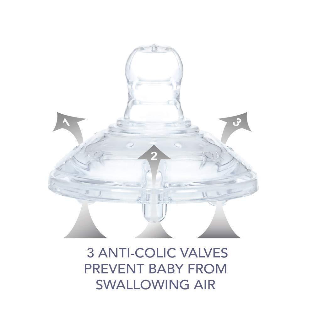 Três válvulas anti-cólicas ultra avançadas que se abrem para evitar que um vácuo se acumule no interior da garrafa, o que pode interromper o fluxo de leite