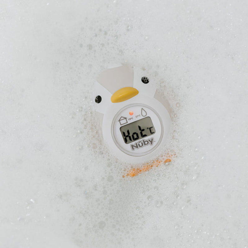 Conheça nosso adorável termômetro de banho e ambiente em forma de pinguim. Este prático pinguim torna a hora do banho super segura, para que você e seu bebê possam se divertir sem preocupações. A tela LCD de fácil leitura fornece uma leitura de temperatura rápida e precisa. Basta tocar no termômetro para ligá-lo e, em seguida, colocá-lo na banheira para verificar a temperatura da água. A temperatura recomendada é de 37 °C. A tela pisca em vermelho quando a água está MUITO QUENTE! Após o banho, basta levar o termômetro com você para o quarto do bebê. Ele pode ficar em pé sobre uma superfície plana (fora do alcance do bebê) para que você possa verificar a temperatura do ambiente a qualquer momento. A temperatura recomendada é de 19 °C.