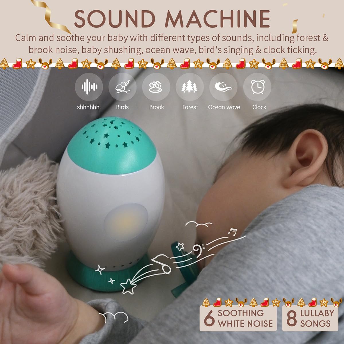 - 【Canções de ninar e ruídos brancos】A máquina de som para bebês fornece 6 sons naturais, incluindo floresta, silêncio, riacho, ondas do mar, pássaros, relógio e 8 canções de ninar para pacificar bebês ou crianças em bons sonhos.