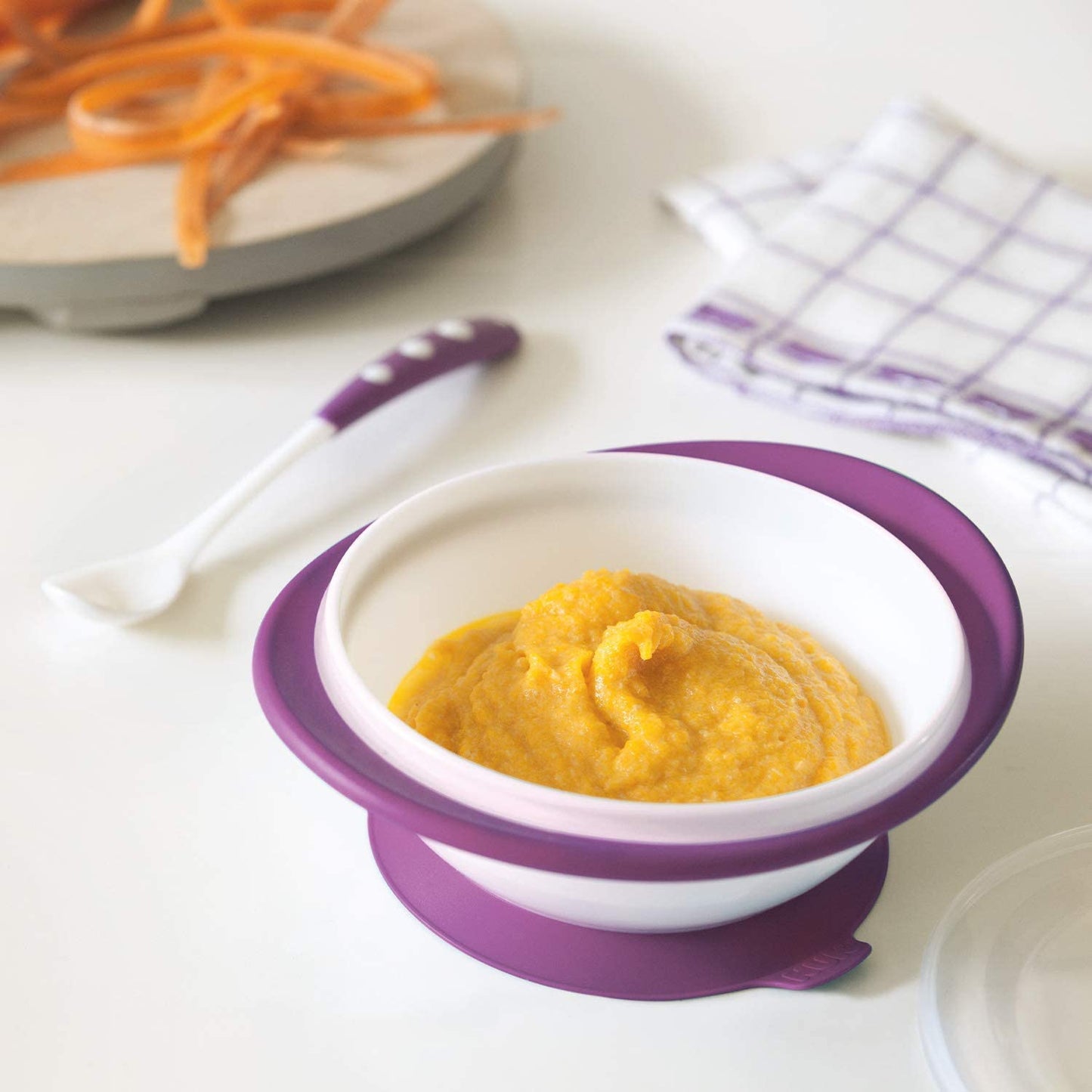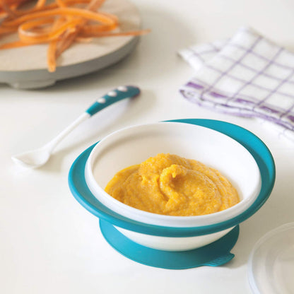 Tigela de alimentação: base de sucção antideslizante para estabilidade; borda inclinada permite que o bebê pegue a comida sozinho