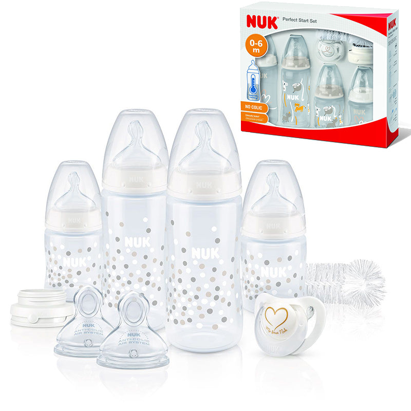 A tetina NUK original é modelada no mamilo da mãe enquanto ela amamenta e, portanto, é bem aceita pelos bebês. Isso significa que é especialmente adequado para bebês que são mamadeira e mamadeira. Dando espaço suficiente para a língua e a mandíbula - e a sensação que os bebês adoram. Com sua zona macia, a ponta do bico de silicone se encaixa perfeitamente no paladar do bebê – para uma sensação natural ao beber. O NUK Anti-Colic Air System garante um fluxo natural para ajudar seu bebê a beber sem engolir ar. Para uma barriguinha feliz.*