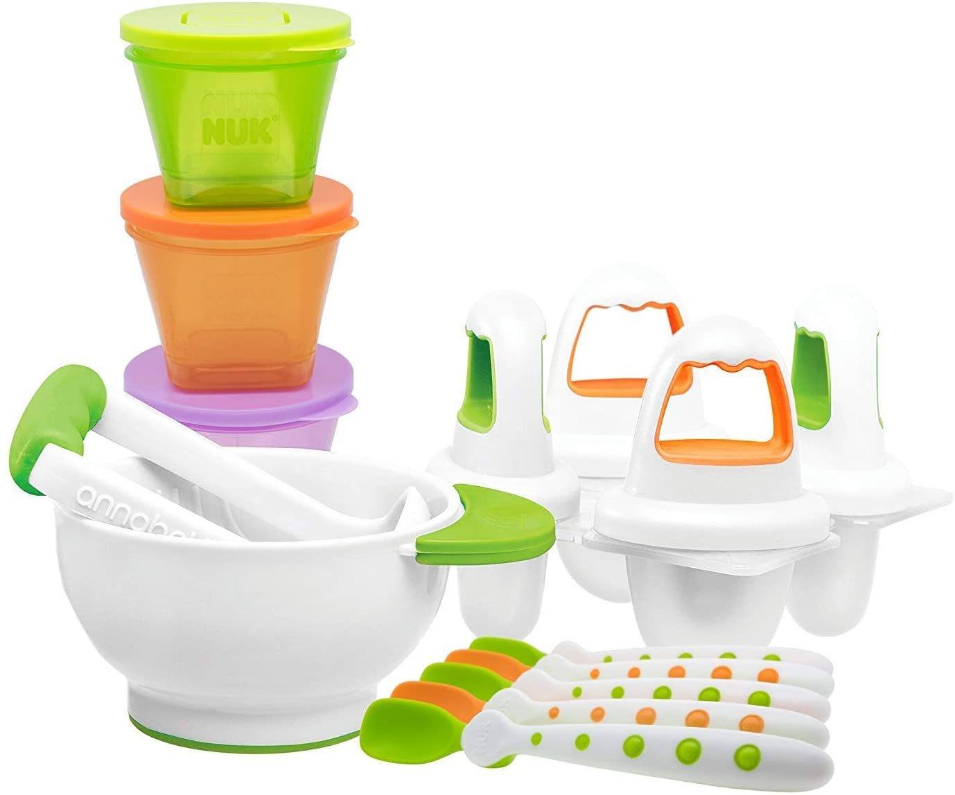 Todas as suas necessidades cobertas - perfeitas para preparar, armazenar e alimentar Inclui espremedor e tigela, potes de armazenamento empilháveis, colheres de alimentação fácil para descansar e mini moldes de picolé