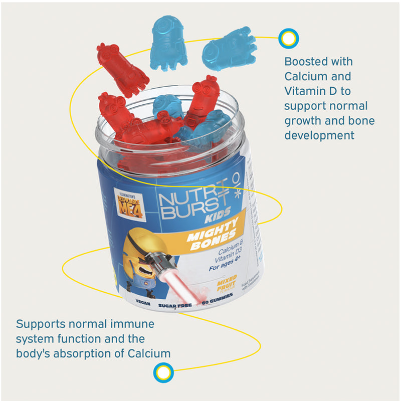 Fizemos uma parceria com a Minions para criar uma goma vitamínica que é o complemento perfeito para a rotina de bem-estar de qualquer criança. Formulada com uma deliciosa mistura de nutrientes essenciais, como cálcio e vitamina D3, para ajudar a promover a saúde, o crescimento e o desenvolvimento geral. Adicionamos especificamente cálcio e vitamina D para auxiliar no crescimento e desenvolvimento ósseo normais durante os anos de desenvolvimento da criança — um período crucial para que as crianças obtenham essas vitaminas vitais em sua dieta. Apoia o funcionamento normal do sistema imunológico e a absorção de cálcio pelo corpo.