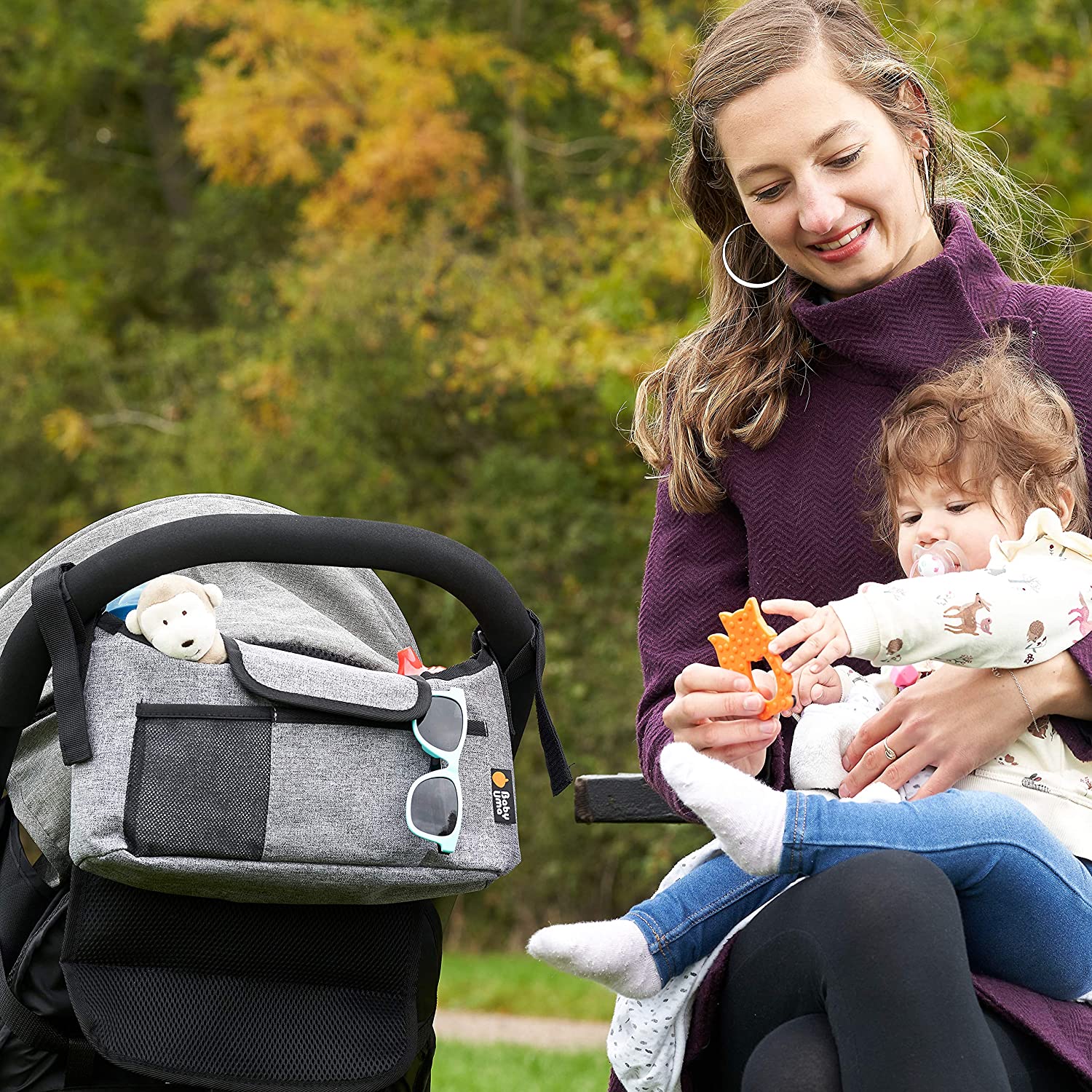 Cinto de ferramentas da múmia - Usar uma bolsa de troca com sua alça longa pendurada na alça do carrinho deixará sua bolsa muito baixa e sempre batendo nas pernas. Em vez disso, use nosso organizador de buggy para manter seus itens essenciais onde você precisa deles, facilmente acessíveis e sem atrapalhar. Na parte superior do buggy e à mão. Não há necessidade de braços estilo Inspector Gadget, pois você obtém acesso fácil aos lenços de água para tirar as coisas pegajosas do rosto do seu filho!