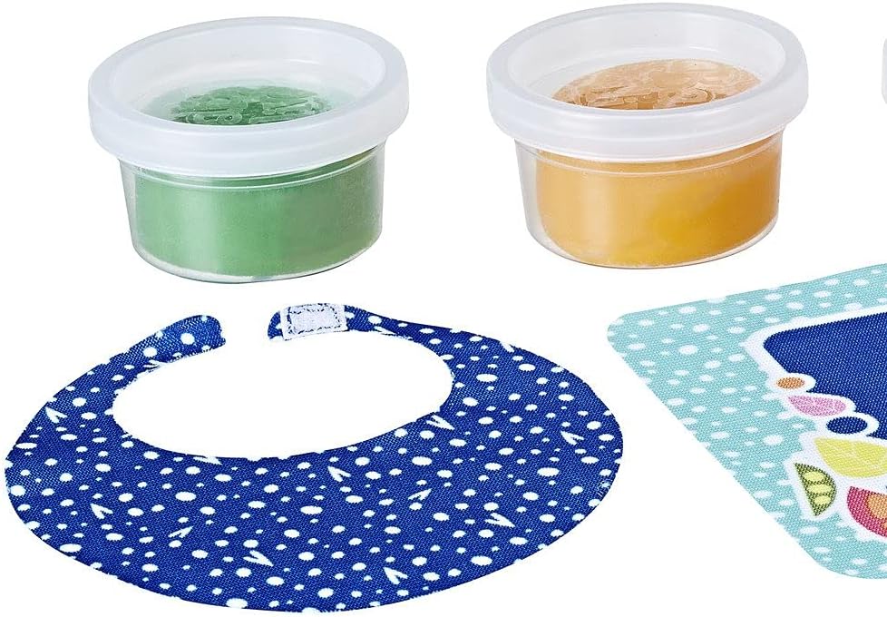 - Inclui 3 recipientes de 30 ml de comida sólida reutilizável para boneca, babador e jogo americano