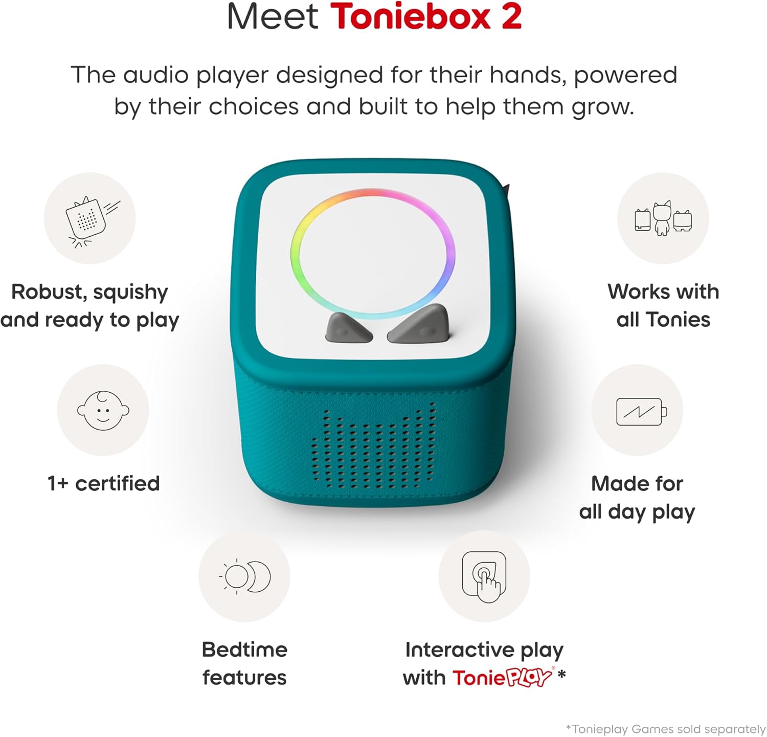 - Ouça, brinque e cresça sem telas com o Toniebox 2. Com centenas de jogos Tonies e Tonieplay para escolher, as crianças podem explorar músicas, histórias e jogos de forma independente ou com toda a família.