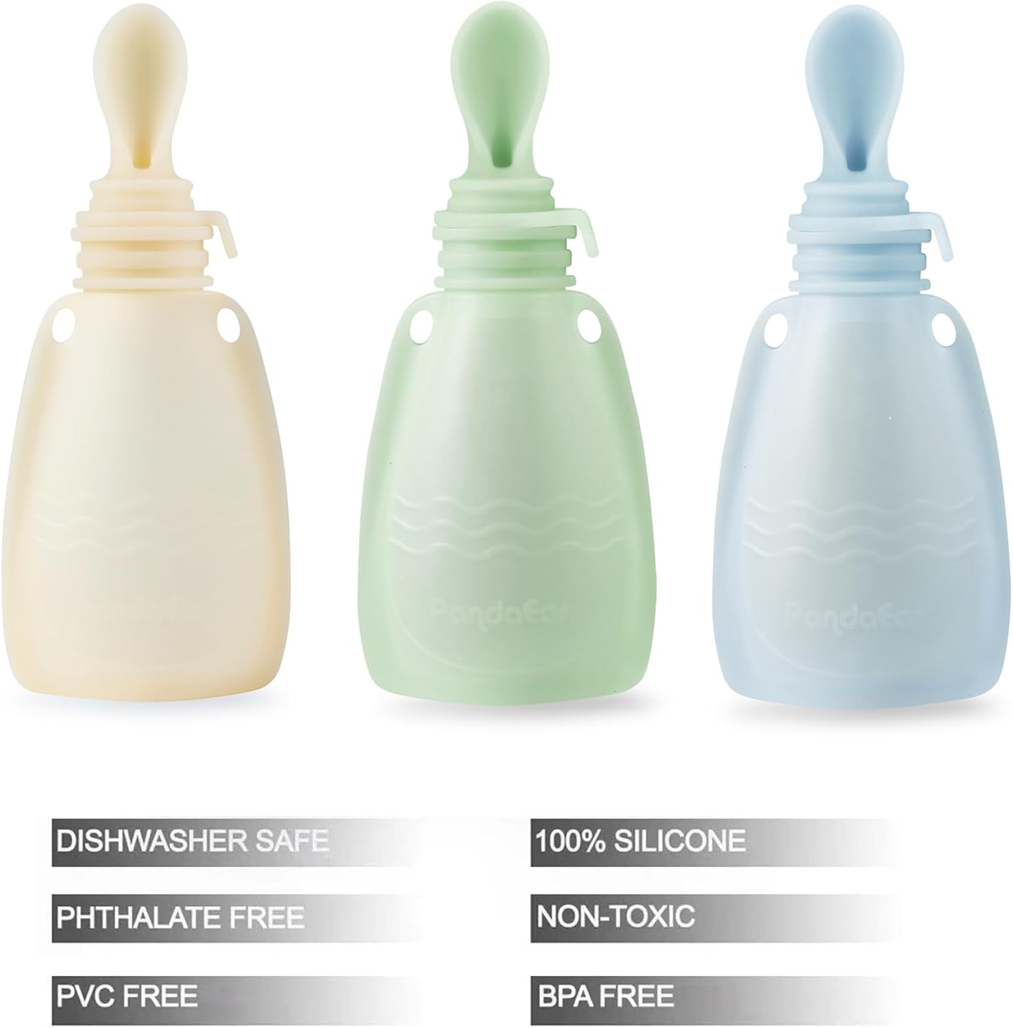 PandaEar 3 Pack Reusable Silicone Baby Food Pouches, Reusable Squeeze Pouches for Toddler Kids with 3 Silicone Puree Feeder Spoon, Silicone Refillable Baby Food Storage (Light Tan/Walnut/Grey)