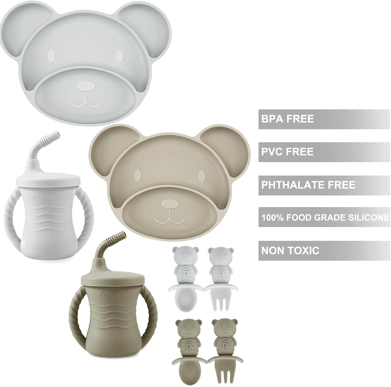 PandaEar Conjunto de Introdução Alimentar para Bebês com 8 Peças, Conjunto de Alimentação de Silicone para Bebês, 2 Pratos Divididos com Ventosas para Bebês em Fase de Introdução Alimentar, 2 Copos de Treinamento para Crianças Pequenas,
