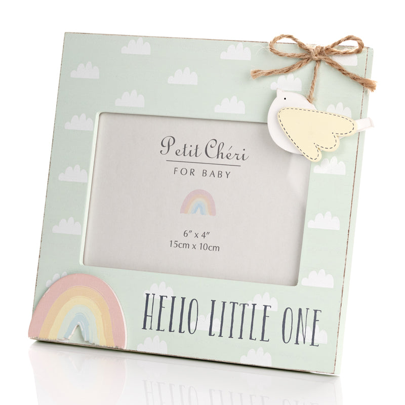 Um lindo arco-íris 3D na parte inferior com as palavras 'HELLO LITTLE ONE' adiciona mais charme a esta moldura que pode conter uma foto de 6 "x 4".