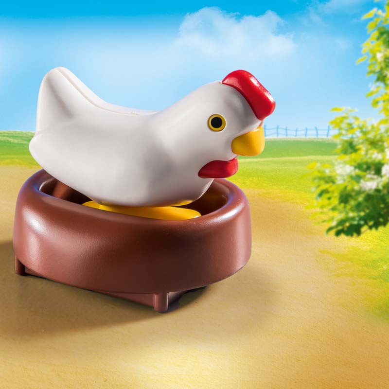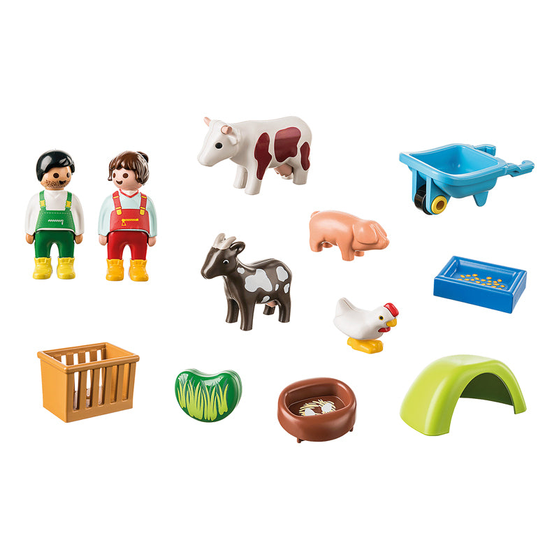 Com os amorosos playsets da PLAYMOBIL 1.2.3, as crianças a partir de 1,5 anos podem começar no grande mundo colorido da PLAYMOBIL e experimentar suas primeiras dramatizações. Os três níveis de aprendizagem que se complementam promovem habilidades motoras finas, criatividade, desenvolvimento da linguagem, compreensão cognitiva e habilidades sociais. O conjunto inclui duas figuras PLAYMOBIL 1.2.3, um porco, uma vaca, uma cabra e uma galinha, um carrinho de mão e outros extras para os primeiros jogos de quinta.