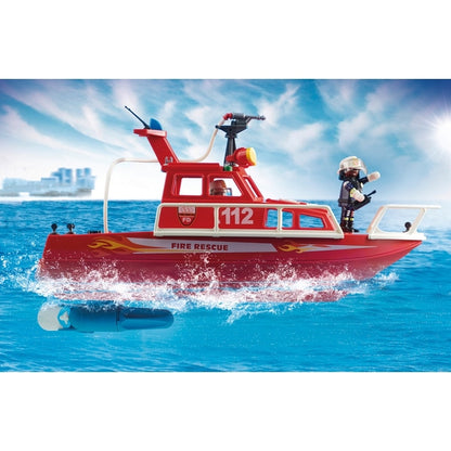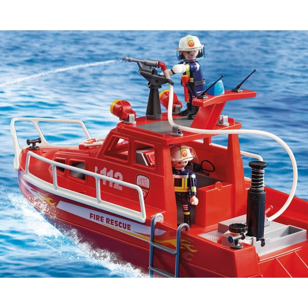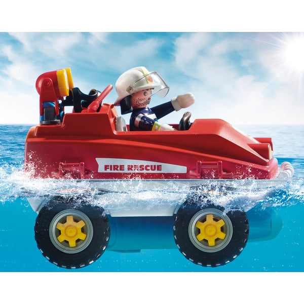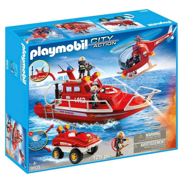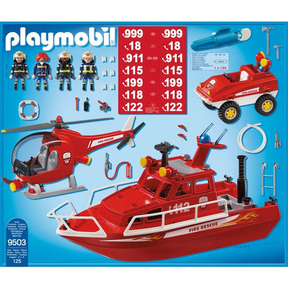 Todos os meios disponíveis são mobilizados para salvar o dia com este Playmobil 9503 City Action Fire Special Forces. Os bombeiros devem extinguir o fogo em uma plataforma em alto mar ... Com quatro bombeiros, um barco equipado com motor submersível (requer bateria 1,5V tipo AA não fornecida), um helicóptero e um veículo anfíbio. O barco flutua e é equipado com uma bomba que projeta água. As hélices do helicóptero giram. Dois personagens podem ser instalados a bordo do helicóptero. O veículo anfíbio flutua e também pode ser equipado com motor submersível.