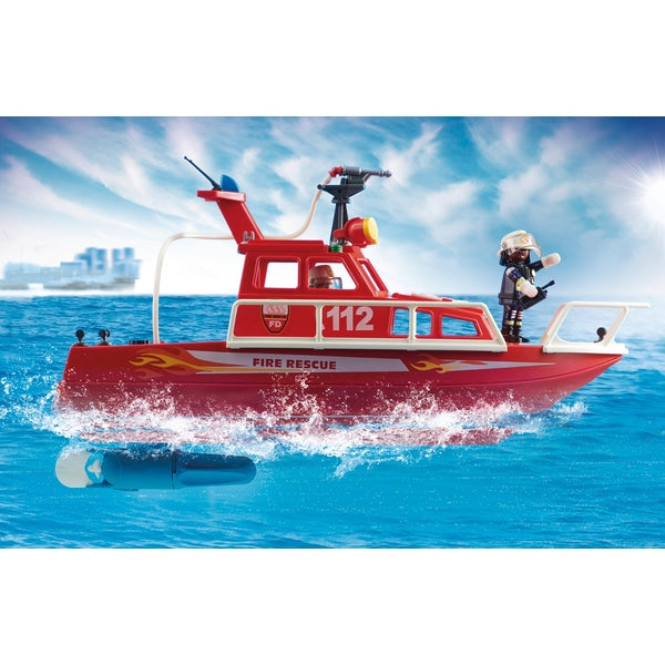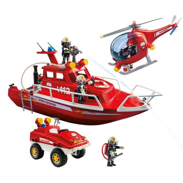4 personagens, 1 carrinho, 1 helicóptero, 1 barco flutuante e acessórios (escada, lançador de fogo, bóia salva-vidas)