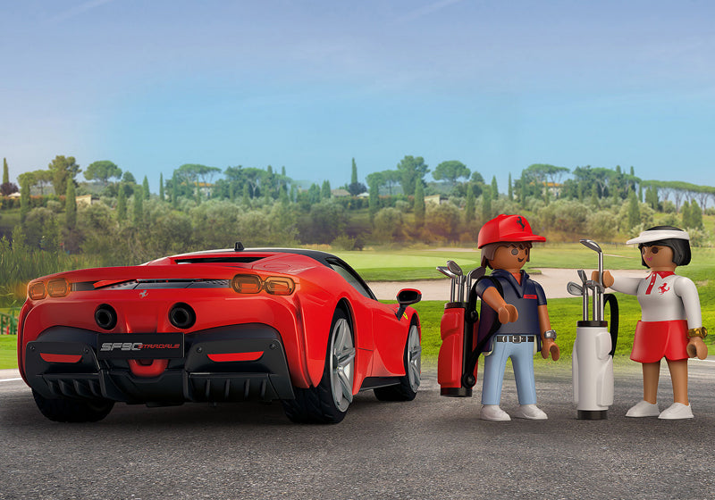 O conjunto inclui uma Ferrari SF90 Stradale com efeitos de luz, duas figuras, sacos de golfe, uma mala e outros acessórios.