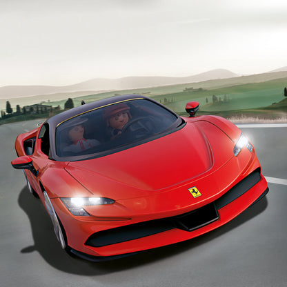 Apresentamos um novo e empolgante supercarro à frota de carros da PLAYMOBIL: a Ferrari SF90 Stradale. Sinta o visual inimitável do veículo Ferrari ganhar vida neste modelo exclusivo da PLAYMOBIL. A Ferrari SF90 Stradale da PLAYMOBIL fascina com linhas elegantes e aerodinâmicas, a icônica cor vermelha brilhante típica dos carros esportivos da Ferrari, design interior autêntico e funções de luz realistas. Remova o teto para revelar o interior detalhado que inclui um painel iluminado, volante com o logotipo da Ferrari e espaço suficiente para acomodar duas figuras da PLAYMOBIL. Dentro do porta-malas você encontrará o motor V8. Uma réplica fantástica do supercarro italiano de produção em série, ideal para todos os amantes de carros exibirem, admirarem ou brincarem.