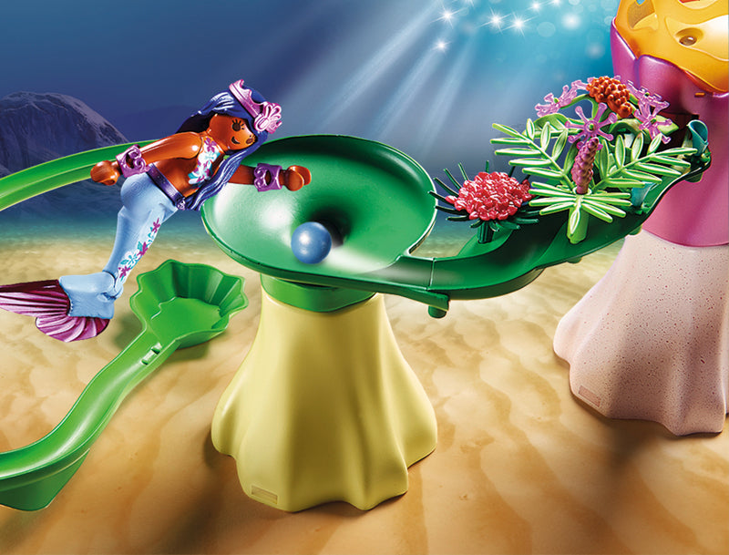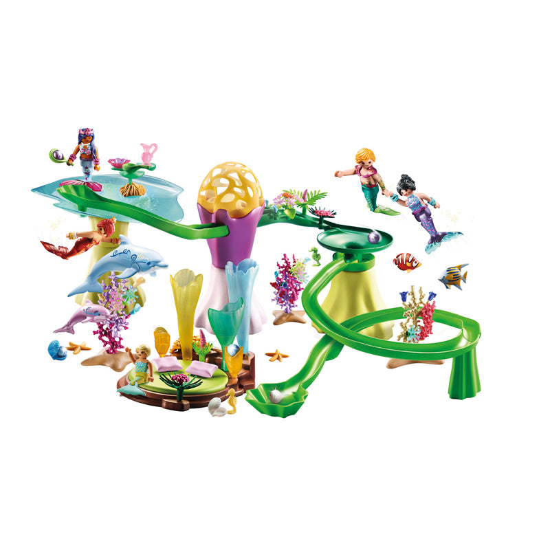 A cúpula iluminada define o cenário - jogue as pérolas no escorregador e observe sua jornada pela enseada. Há uma plataforma na parte superior para desfrutar de belas vistas, bem como um local na parte inferior para relaxar. As sereias são acompanhadas por 2 golfinhos flutuantes e outros amigos do mundo marinho.