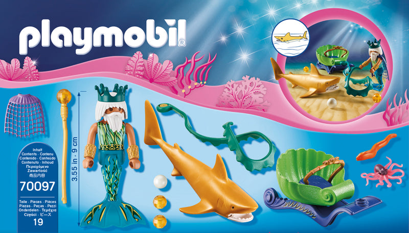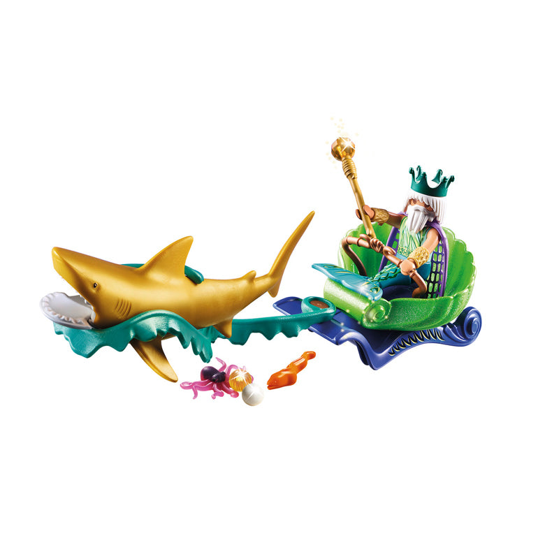Ele usa sua coroa e segura seu cetro. A carruagem tem espaço suficiente para acomodar 1 figura Playmobil e é puxada pelo tubarão dourado, que também pode flutuar na água. O arreio para o tubarão é destacável da carruagem.