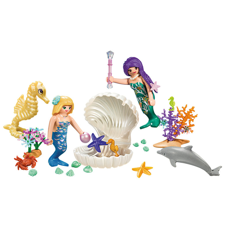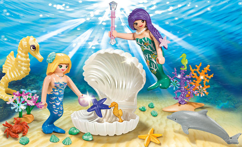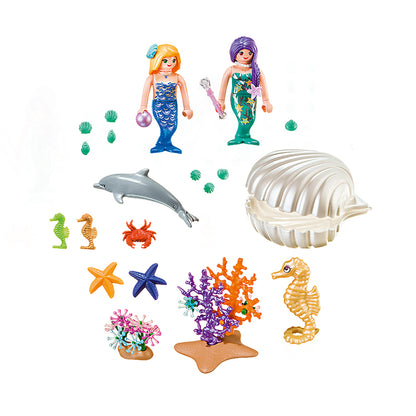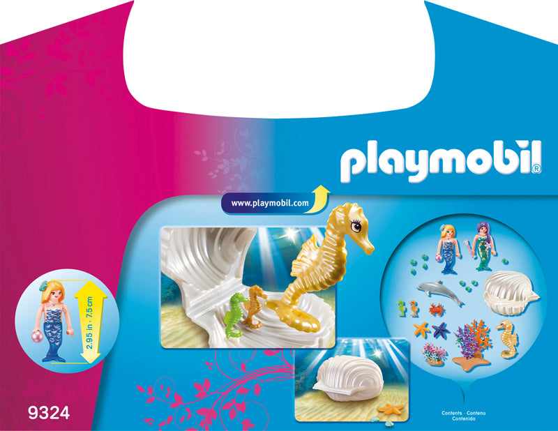 Perfeita para diversão mágica em movimento, a mala de transporte Playmobil 9324 Mermaid apresenta duas sereias, acompanhadas por seus amigos subaquáticos de confiança.