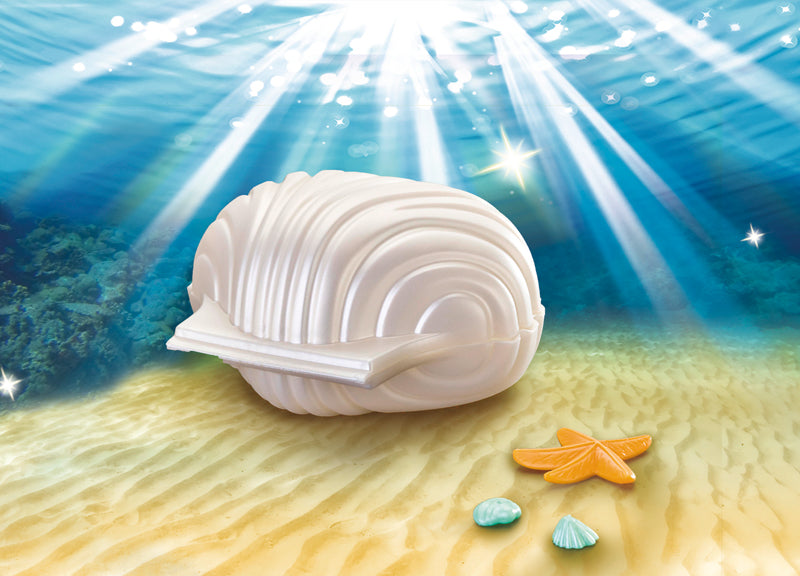O conjunto de brinquedos para viagens inclui uma pérola que pode ser guardada no molusco, que abre e fecha, e acessórios.