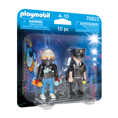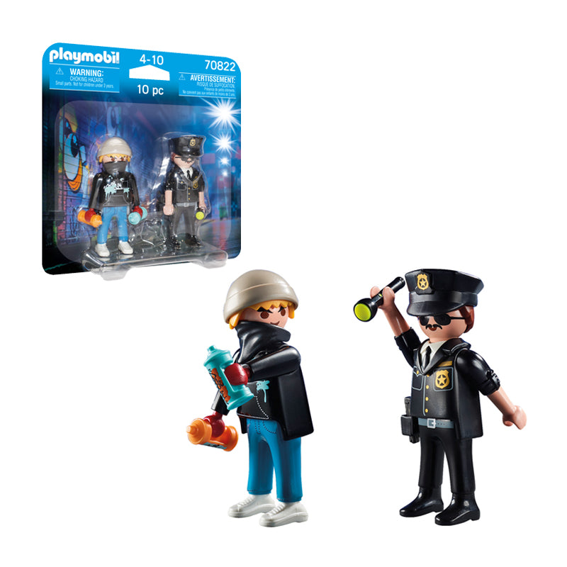 - Apresentando uma figura de policial e grafiteiro, este DuoPack pode ser combinado com qualquer conjunto de jogos PLAYMOBIL para completar a cena. Os chapéus de ambas as figuras podem ser removidos e ambos podem conter acessórios.