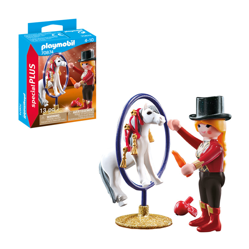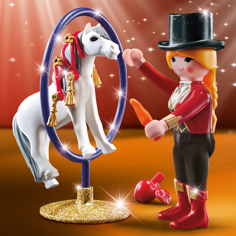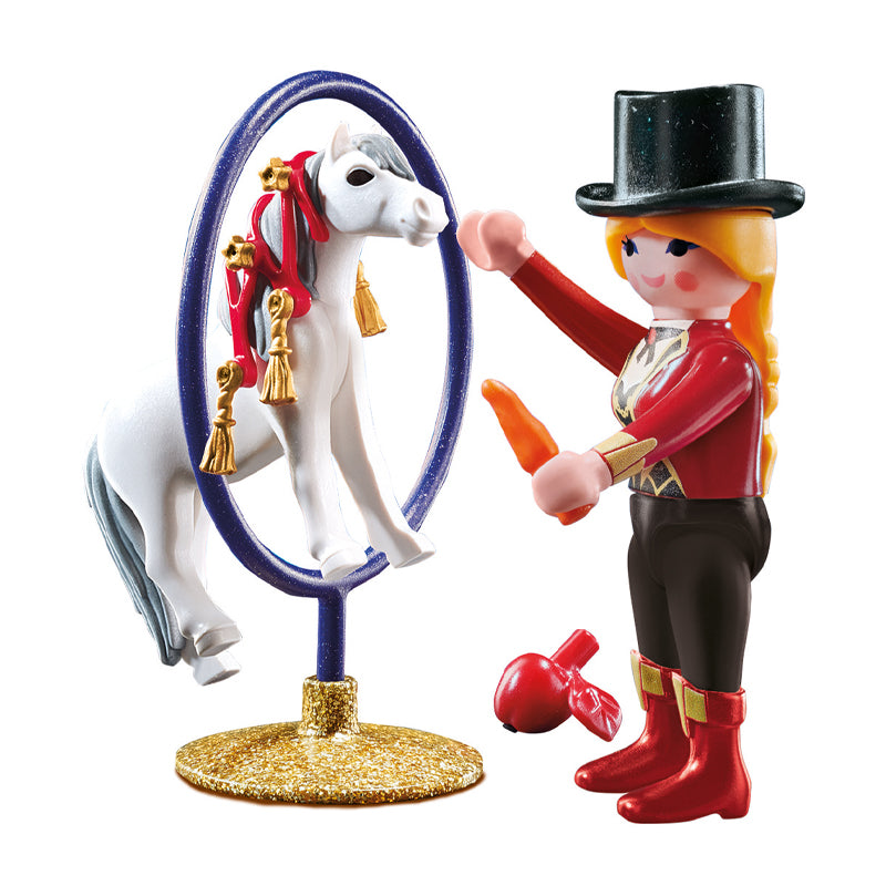 - Para a grande apresentação, a treinadora e seu cavalo estão prontos para partir. Prenda o aro em seu suporte dourado e observe o cavalo saltar para uma manobra espetacular.
