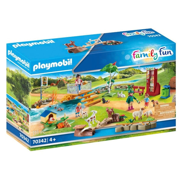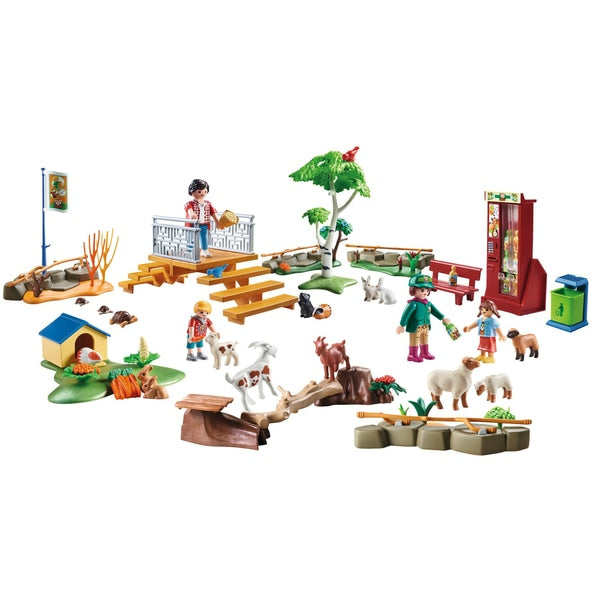 Conteúdo: 4 figuras, 2 cabras, 1 cabra jovem, 1 ovelha, 2 cordeiros, 2 coelhos, 2 coelhos bebês, 1 tartaruga, 2 tartarugas, 3 porquinhos-da-índia, 2 pássaros, 1 comedouro automático, 2 grama, 2 palha com plantas , 1 ponte de escada, 1 árvore, 2 raízes de árvore, 1 mastro, 1 banco, 1 pequeno biotério, 1 cesto de lixo, 1 mochila, 1 cacho de cenouras, 1 cenoura, 8 sacos de ração, 1 gorro pontudo, 1 saco com ração e 1 feed