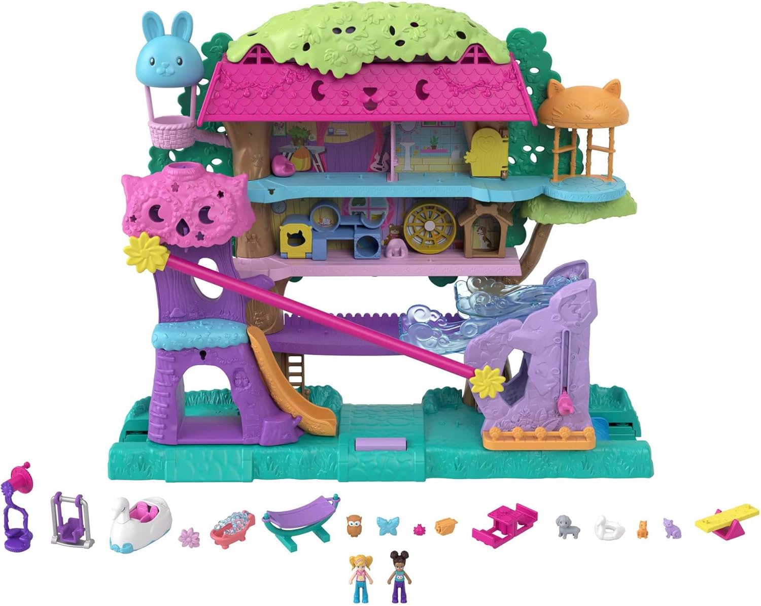 Polly Pocket Casa de boneca com 2 micro bonecas e acessórios, carro de brinquedo, funriture e 4 animais de estimação, casa de aventura expansível para animais de estimação, HHJ06