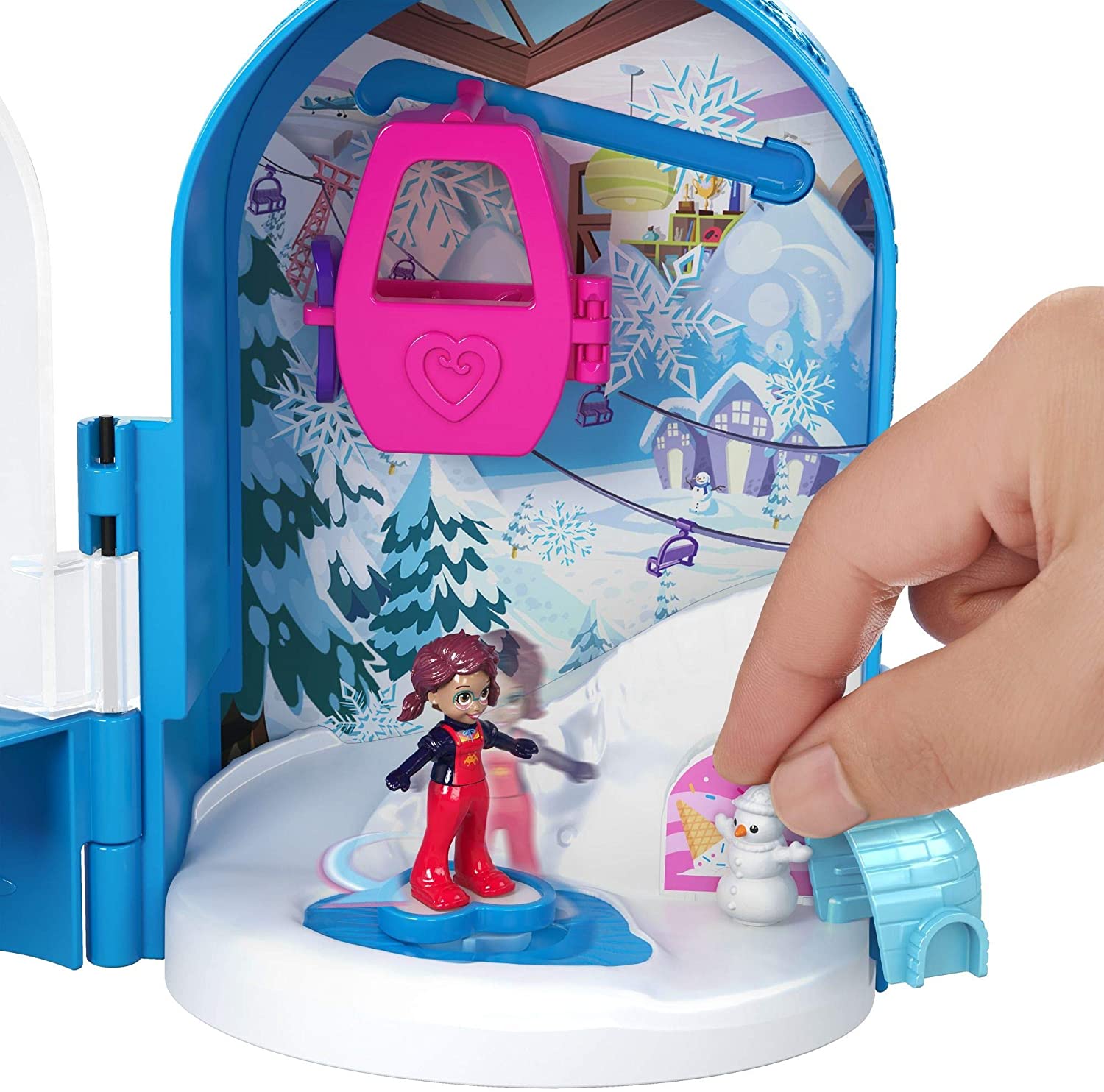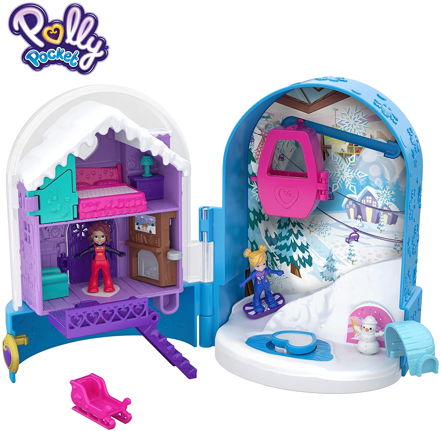 Com a forma de um globo de neve, o Polly Pocket World Snow Secret Compact abre para um mundo temático que é o mais divertido de neve com bonecas Polly e Shani, um chalé de esqui para ficar e uma gôndola ao ar livre e colina para andar e deslizar!