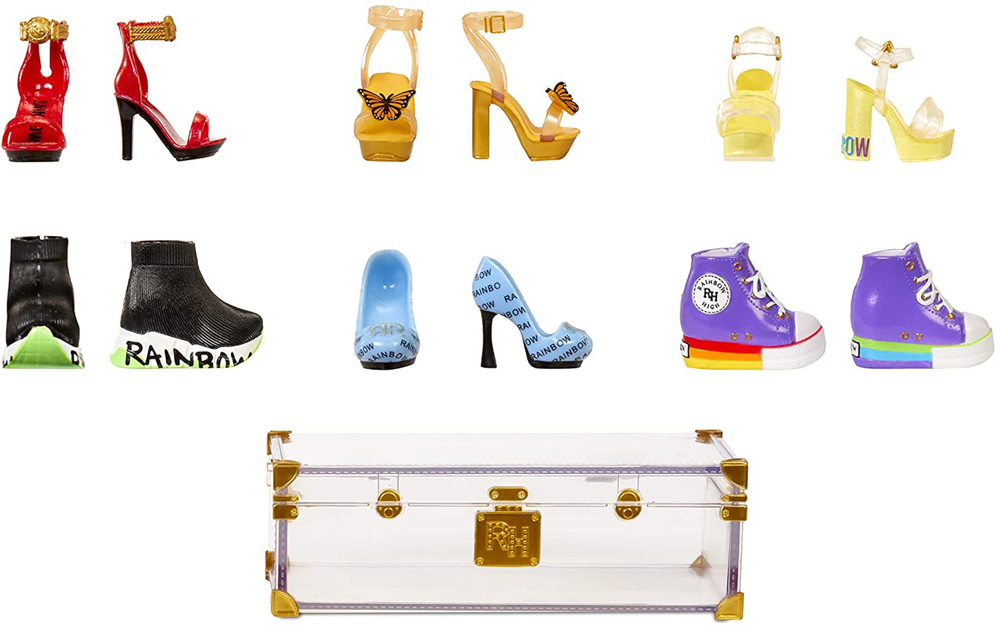 400+ LOOKS - Este armário de moda claro e estilo baú com acabamentos dourados vem com mais de 31 peças de moda para misturar e combinar para criar mais de 400 combinações. Muitas roupas de boneca e acessórios de boneca! Bonecas de alta moda arco-íris vendidas separadamente
