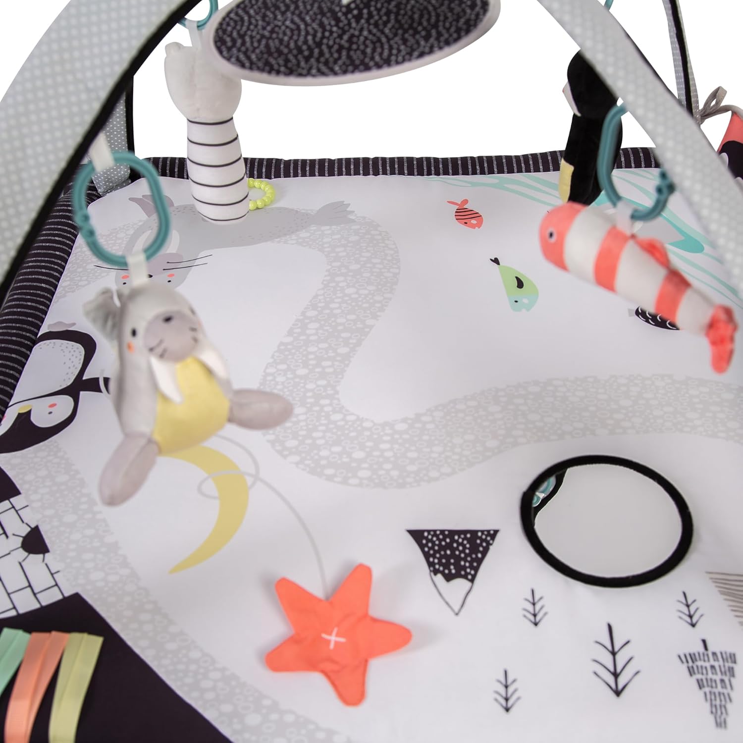 - Os recursos de jogo incluem espelho, mordedores e chocalhos para muita diversão.