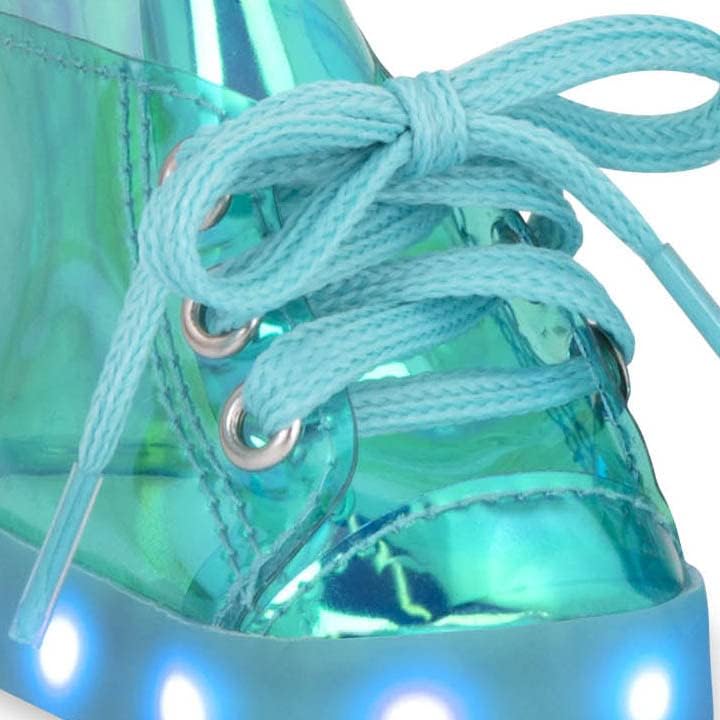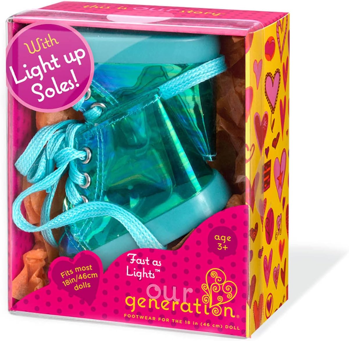 - Os ténis Our Generation Fast As Lights Light Up são ténis de cano alto azul-esverdeado com acabamento metálico que permitirão que o seu filho e as suas bonecas Our Generation roubem o protagonismo por onde quer que passem.