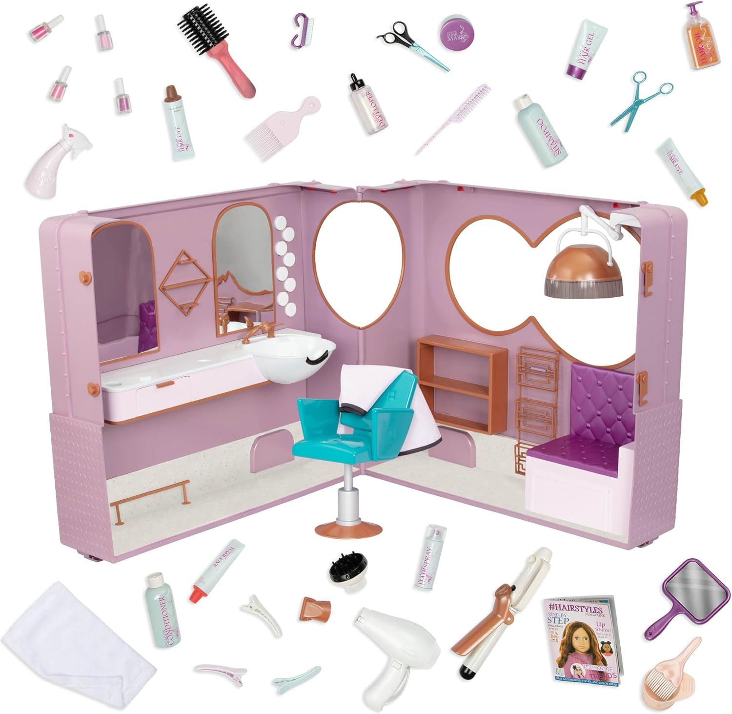 Salão de beleza Our Generation sobre rodas – Conjunto de reboque com tema de salão de beleza dobrável – Conjunto de salão de cabeleireiro com 35 peças