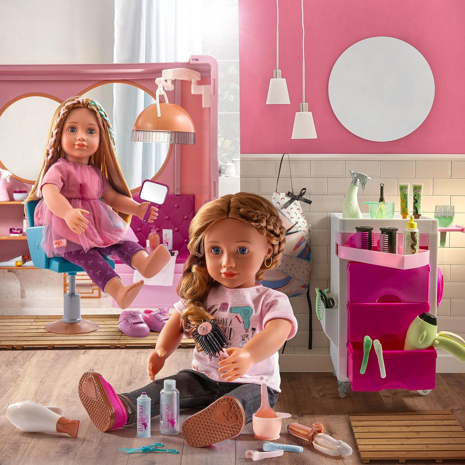 - Salão sobre Rodas; este conjunto de salão de beleza para bonecas de 46 cm pode ser dobrado e transformado num atrelado, para que possa levar o seu penteado para qualquer lugar!