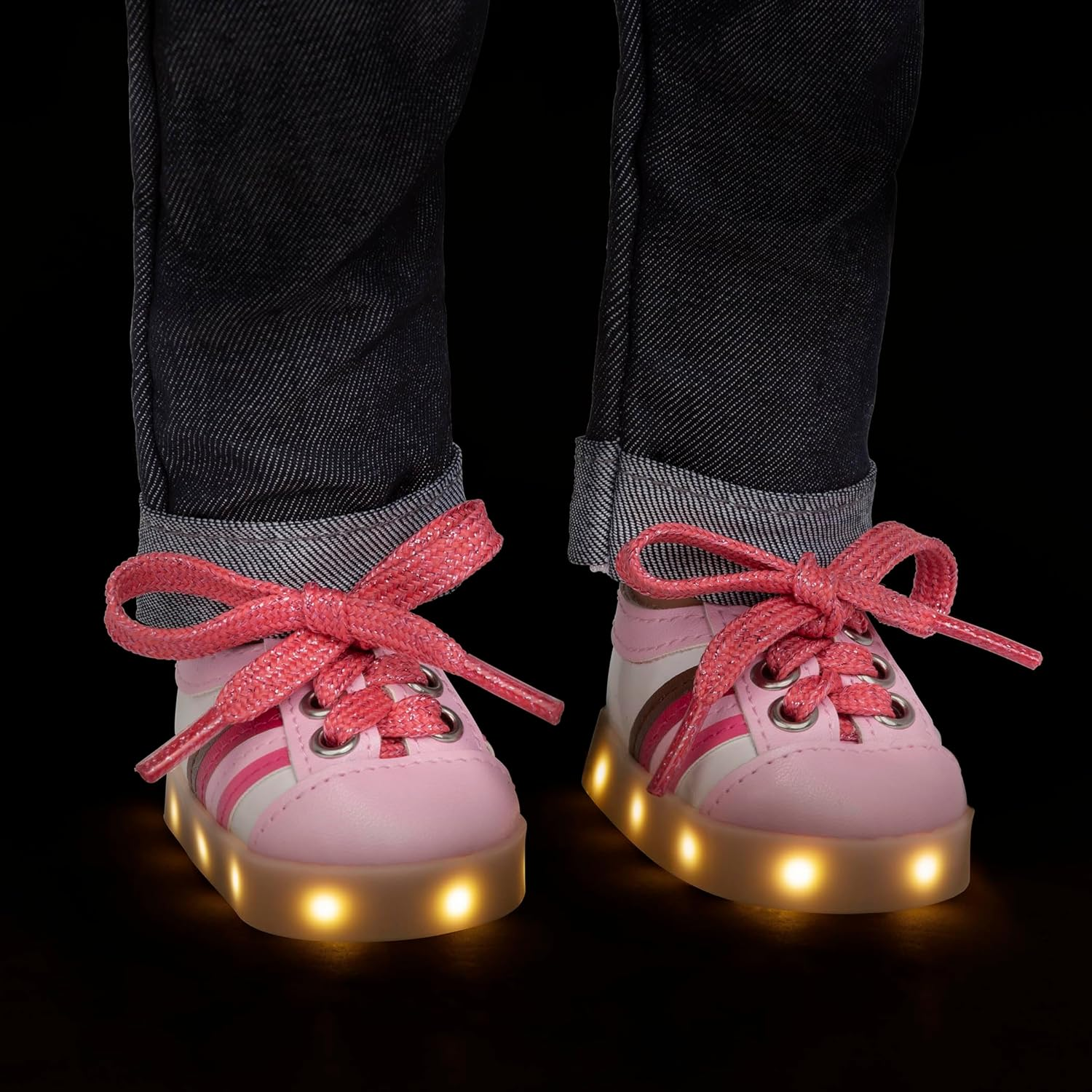 - Rainbow Delight; estes sapatos iluminam mesmo! Ilumine as roupas da sua boneca de 46 cm com estes ténis iluminados.