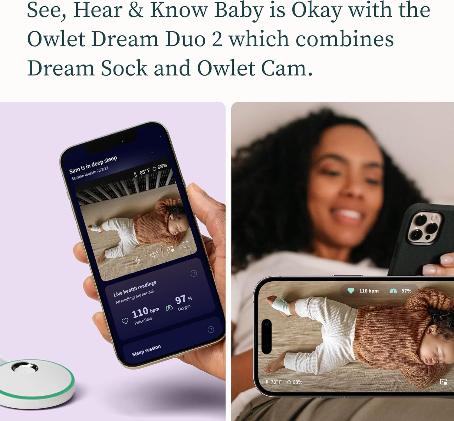- O Owlet Dream Bundle inclui o monitor de bebê inteligente Dream SockTM com certificação médica e o monitor de vídeo inteligente Owlet Cam 2.