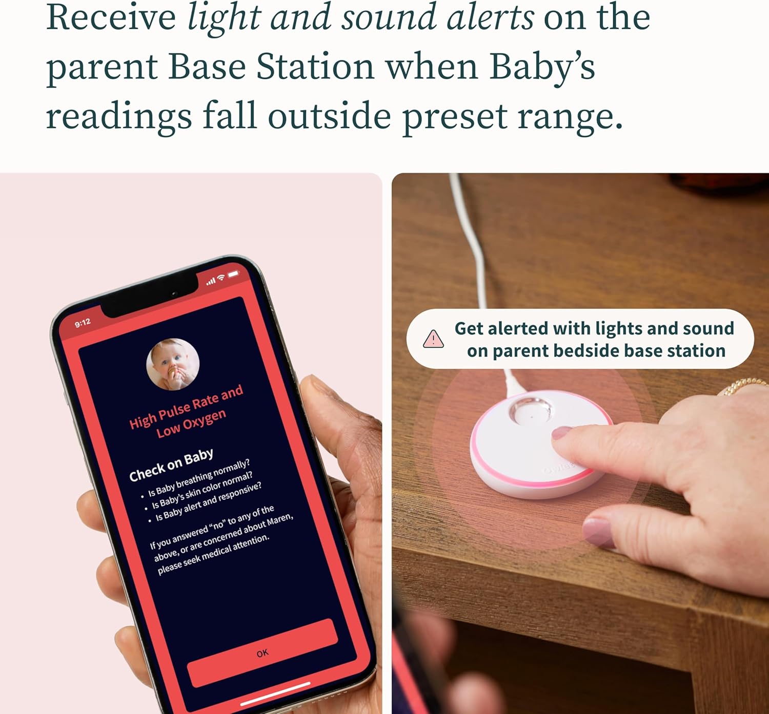 - Saiba quando você for necessário: se as leituras de saúde do seu bebê estiverem fora dos intervalos predefinidos, você será notificado em tempo real por meio de luzes e sons na estação base incluída, bem como notificações no aplicativo.