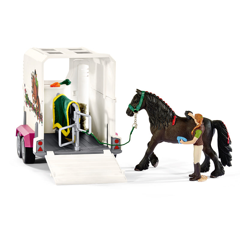 Por adorar tanto, Betty, o noivo, dá outra boa escovada em sua égua Frísia, Bella. O cavalo pode sentir que algo especial está acontecendo hoje. E ela está certa: hoje, Bella está sendo levada para sua nova barraca. Depois de ter sido devidamente cuidada, Betty a conduz cuidadosamente até a espaçosa caixa para cavalos.