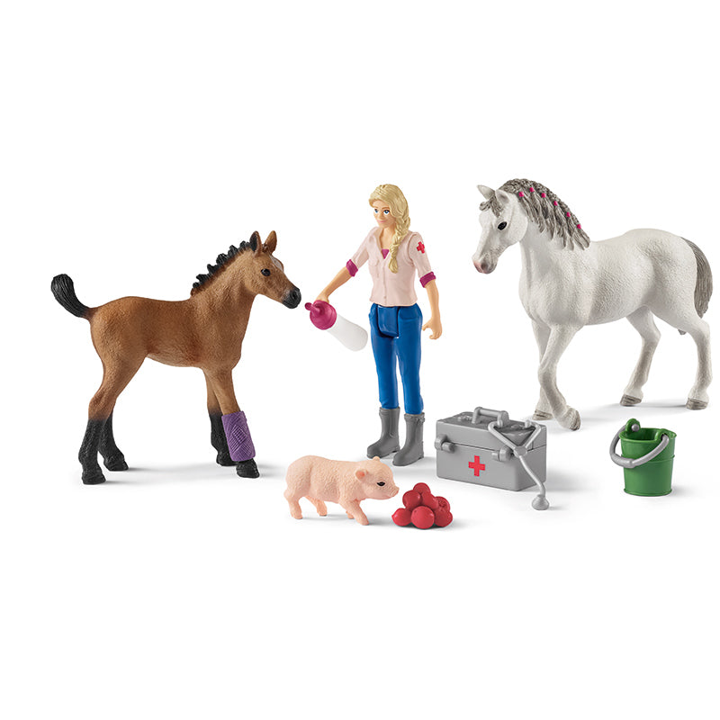 Um ótimo complemento para o novo estábulo de cavalos com 3 animais fofos, um veterinário e muitos acessórios. As estatuetas Schleich® são modeladas nos mínimos detalhes e incentivam as crianças a brincar e aprender.