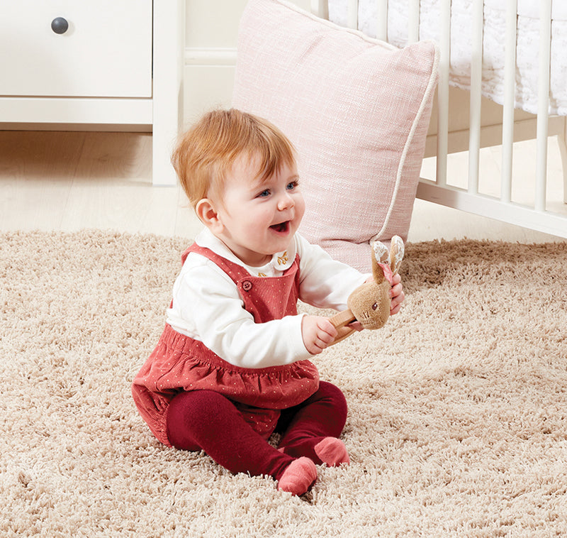 O adorável Signature Flopsy Bunny Ring Rattle apresenta diferentes texturas, cores e um chocalho suave para fornecer estimulação sensorial e encorajar o bebê a explorar seus sentidos através da brincadeira. O anel de madeira FSC com propriedades antibacterianas é fácil de segurar pelas mãos pequenas e também oferece alívio para os pequenos. Ele também apresenta as palavras, 'Flopsy Bunny'. O anel é combinado com a pelúcia mais macia e de alta qualidade para a cabeça de Flopsy, com um sofisticado tecido 100% algodão estampado nas orelhas internas, finalizado com um laço de pescoço inteligente, que juntos fornecem um apelo contemporâneo e tradicional.