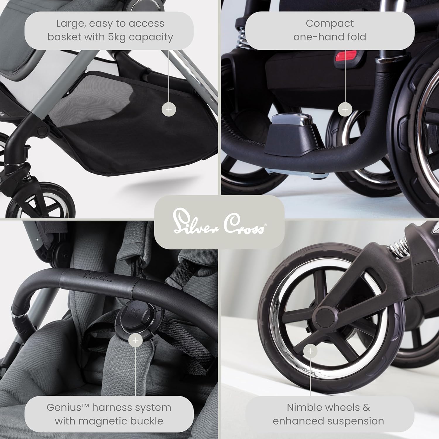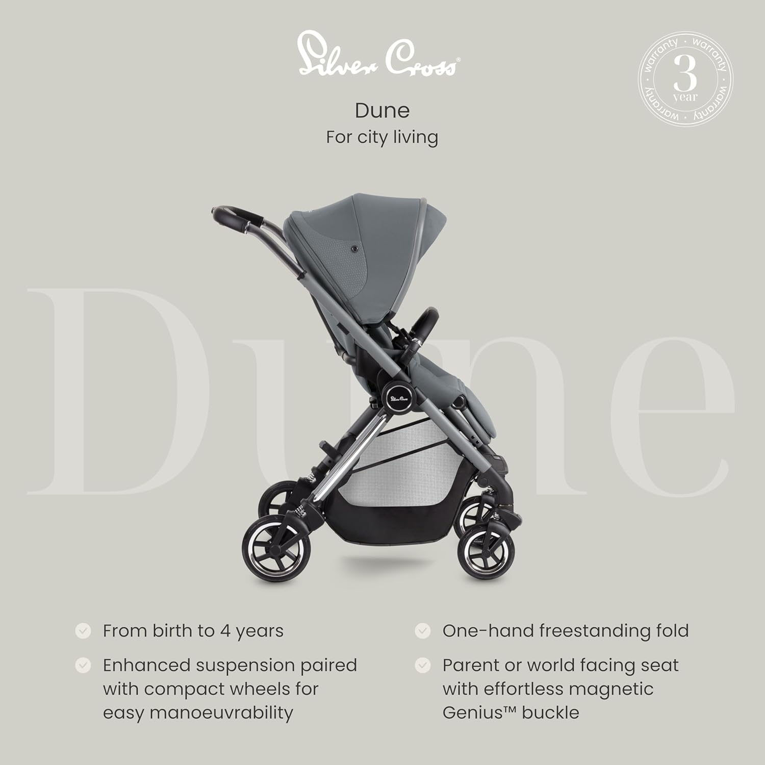 - SEGURANÇA E CONFORTO - Nosso carrinho Dune mantém o bebê seguro com nosso sistema de arnês Genius com fivela magnética, para garantir um ajuste seguro e uma suspensão aprimorada de 4 rodas que combate meios-fios e cantos apertados com a suspensão de mola aprimorada do Dune.