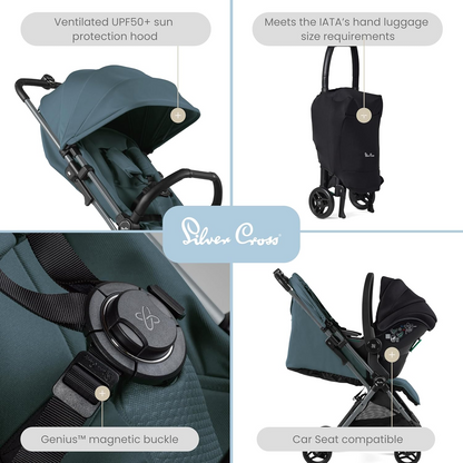 Silver Cross - Jet 5 Compact Carrinho de bebé e acessórios Bundle - Carrinho de viagem, tabuleiro para snacks, suporte para telefone e adaptadores universais para cadeira auto - Carrinho dobrável - Recém-nascido a 4 anos - Mineral