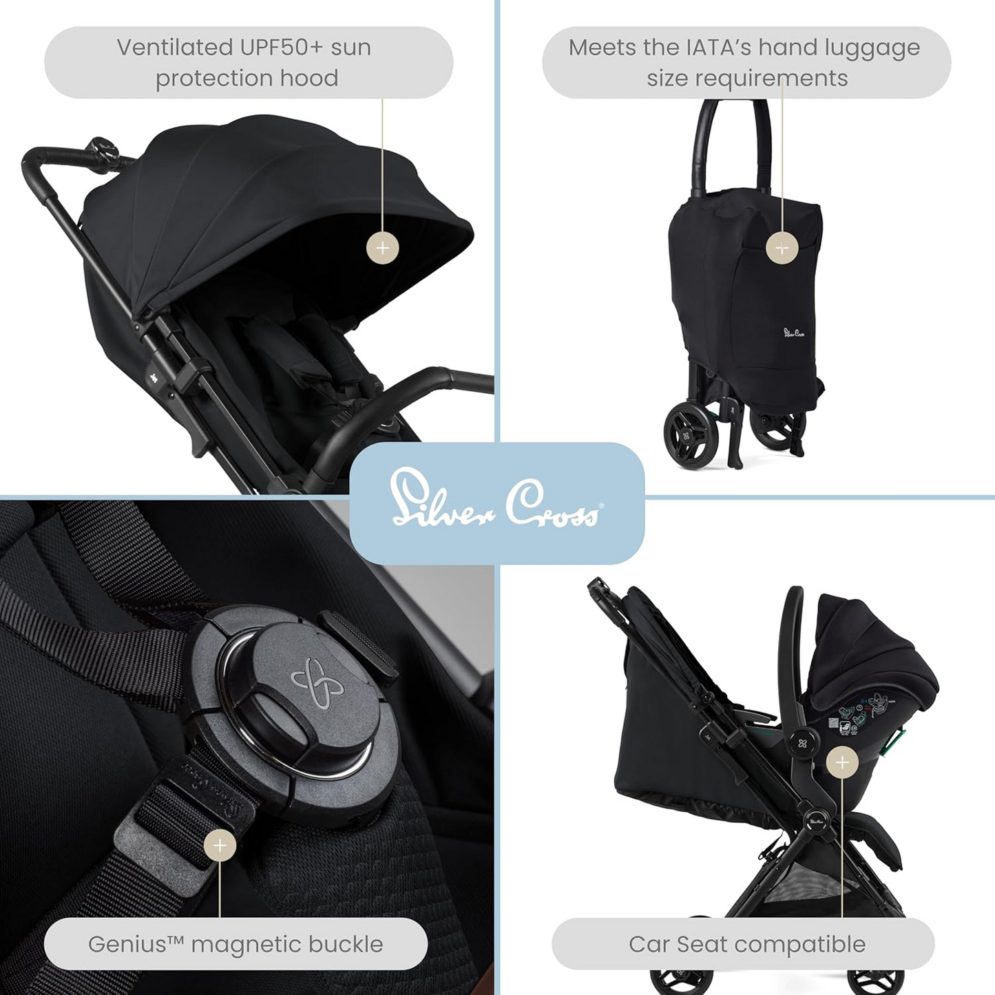 Silver Cross - Jet 5 Compact Carrinho de bebé e acessórios Bundle - Carrinho de viagem, tabuleiro para snacks, suporte para telefone e adaptadores universais para cadeira auto - Carrinho dobrável - Tamanho de cabine - Recém-nascido a 4 anos - Espaço