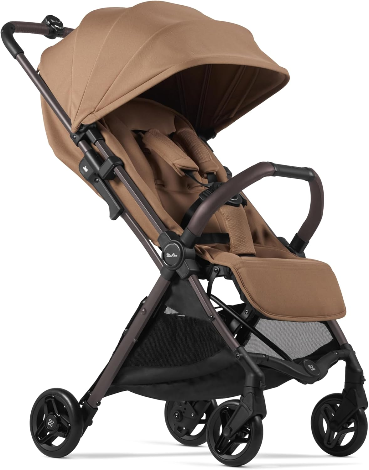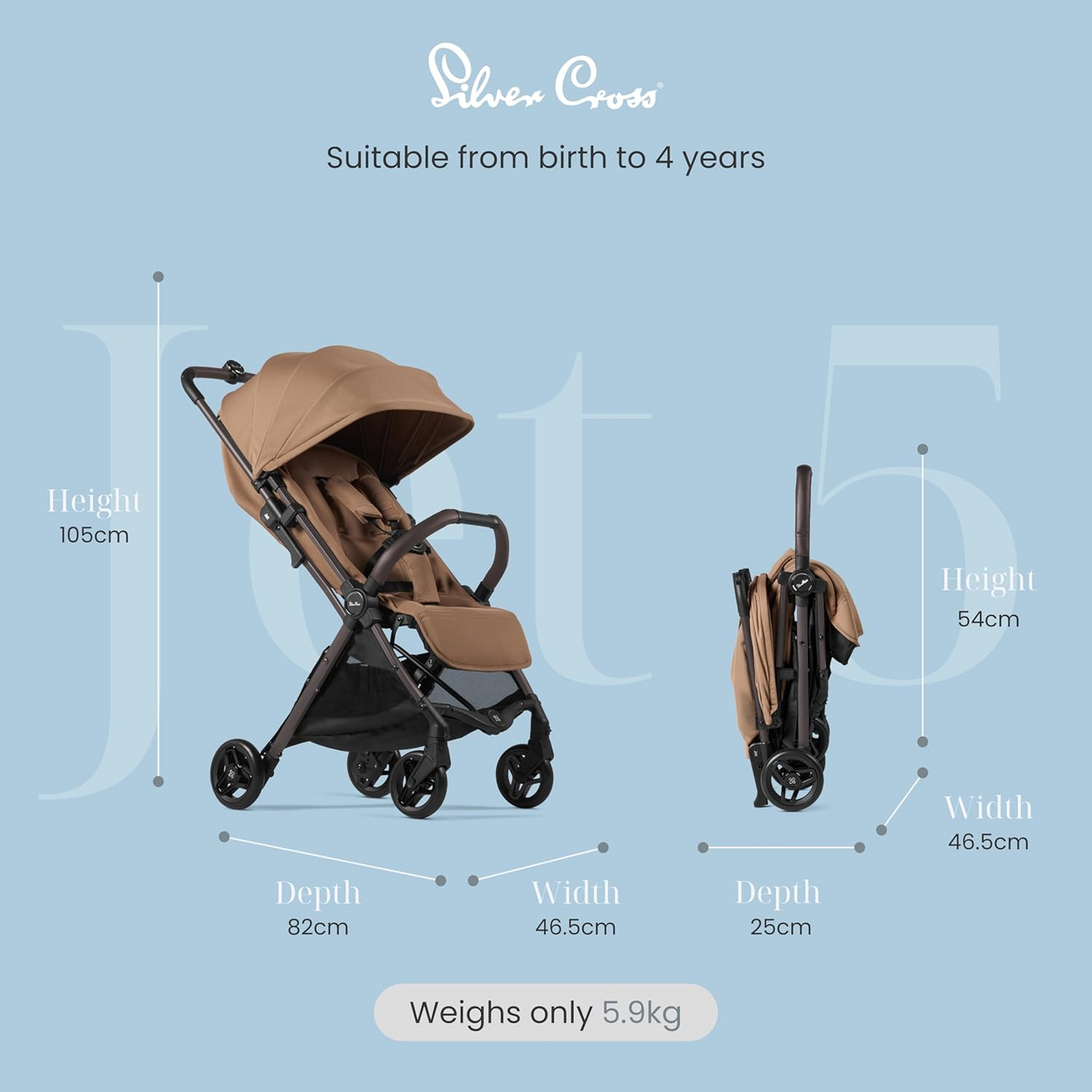 Silver Cross - Jet 5 Compact Travel System Ultimate Bundle - Carrinho de viagem, cadeira auto Dream i-Size, tabuleiro para snacks e suporte para telemóvel - Carrinho de passeio dobrável leve - Recém-nascido a 4 anos - Canela