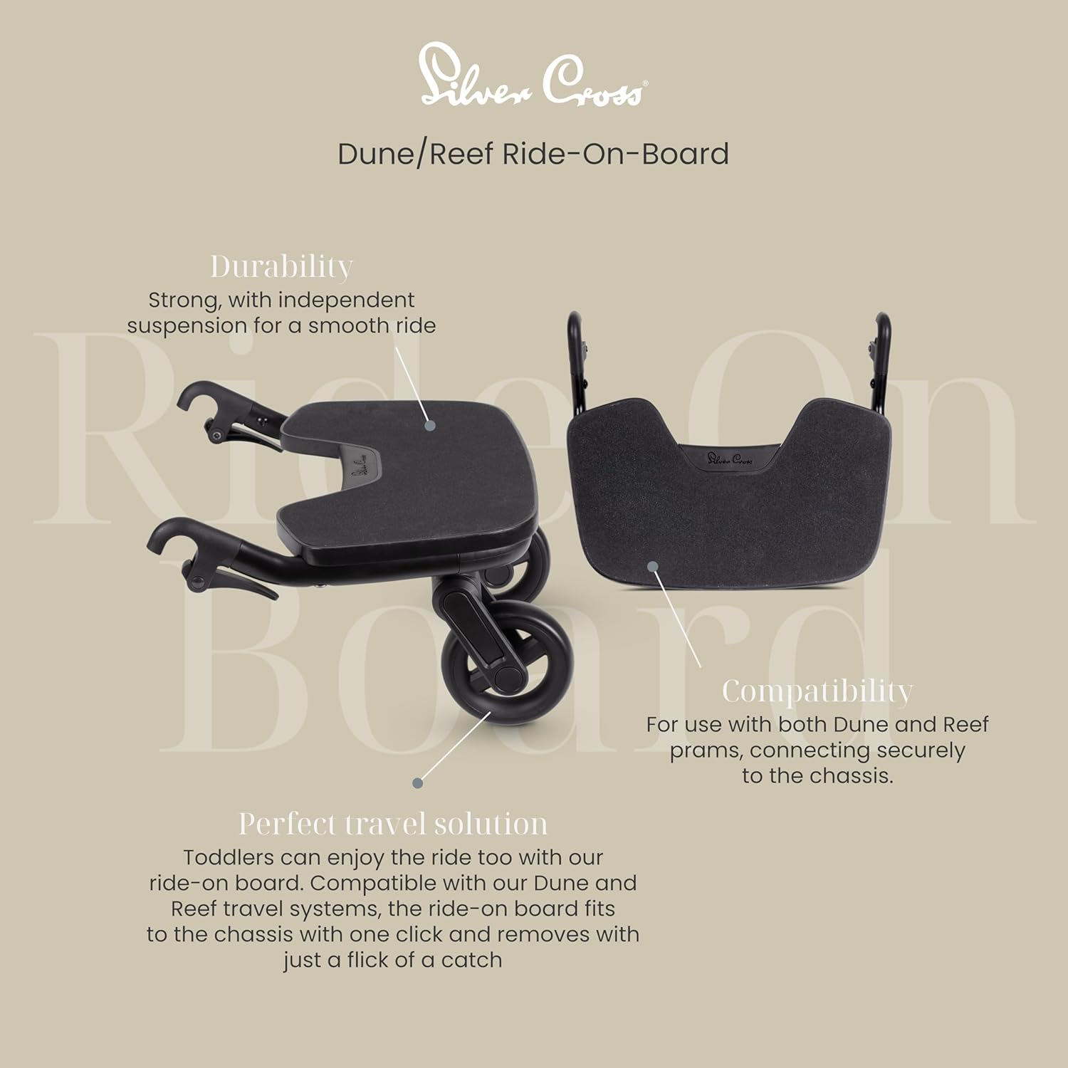 As crianças também podem aproveitar o passeio com o nosso novo carrinho Ride-On-Board. Compatível com os nossos novos sistemas de viagem Dune ou Reef, o Ride-On-Board encaixa no chassis com um clique e remove-se com um simples movimento de uma trava. Adequado para crianças até aproximadamente 4 anos, o Ride-On-Board é perfeito para as perninhas cansadas das crianças em caminhadas mais longas. Uma prática alça permite prender o Ride-On-Board ao cesto quando não estiver em uso.