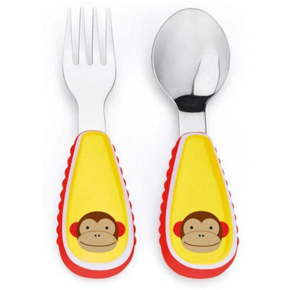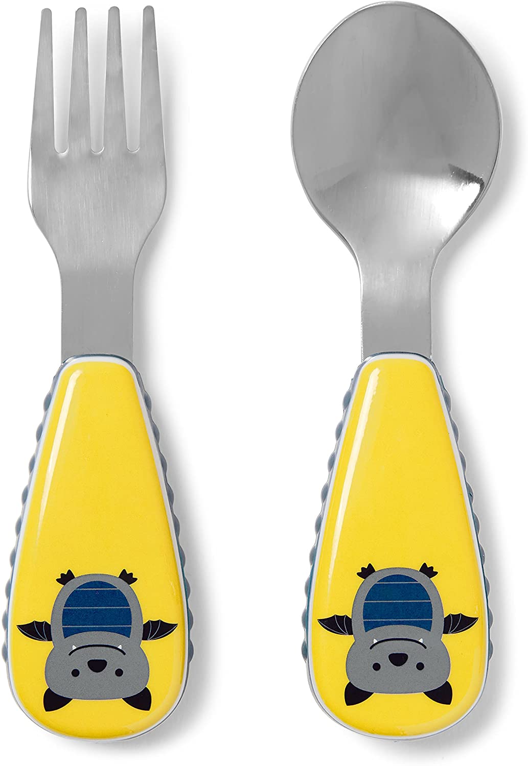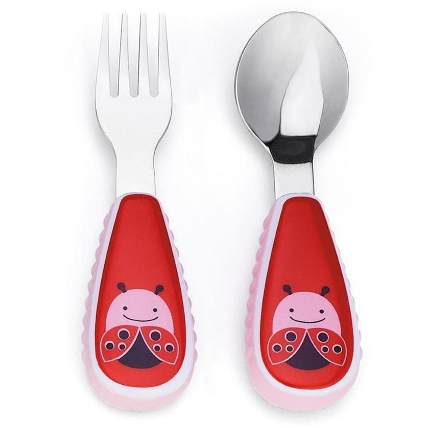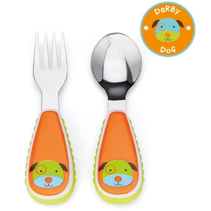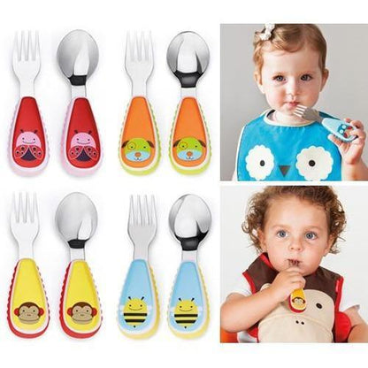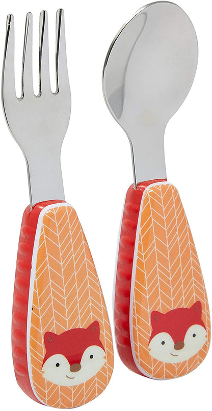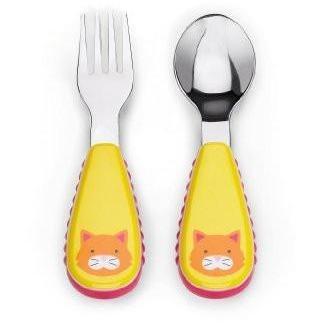 Esta colher e garfo adoráveis alças laterais macias por isso é fácil para os pequeninos segurarem. Cabeças de aço inoxidável fazem os mais pequenos se sentirem crescidos!